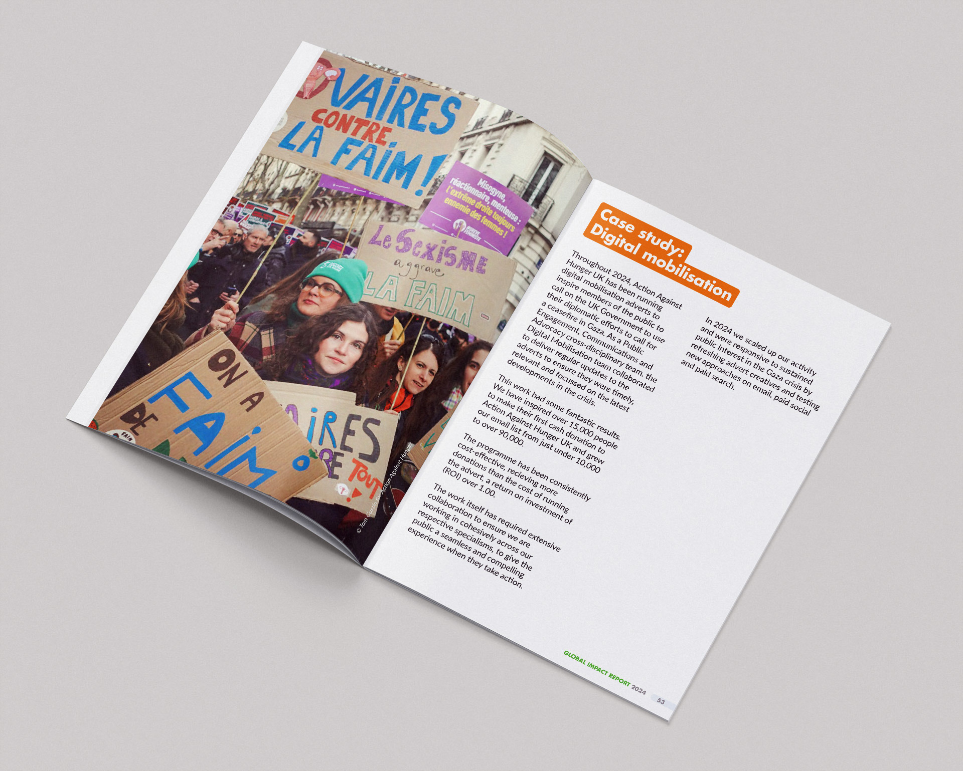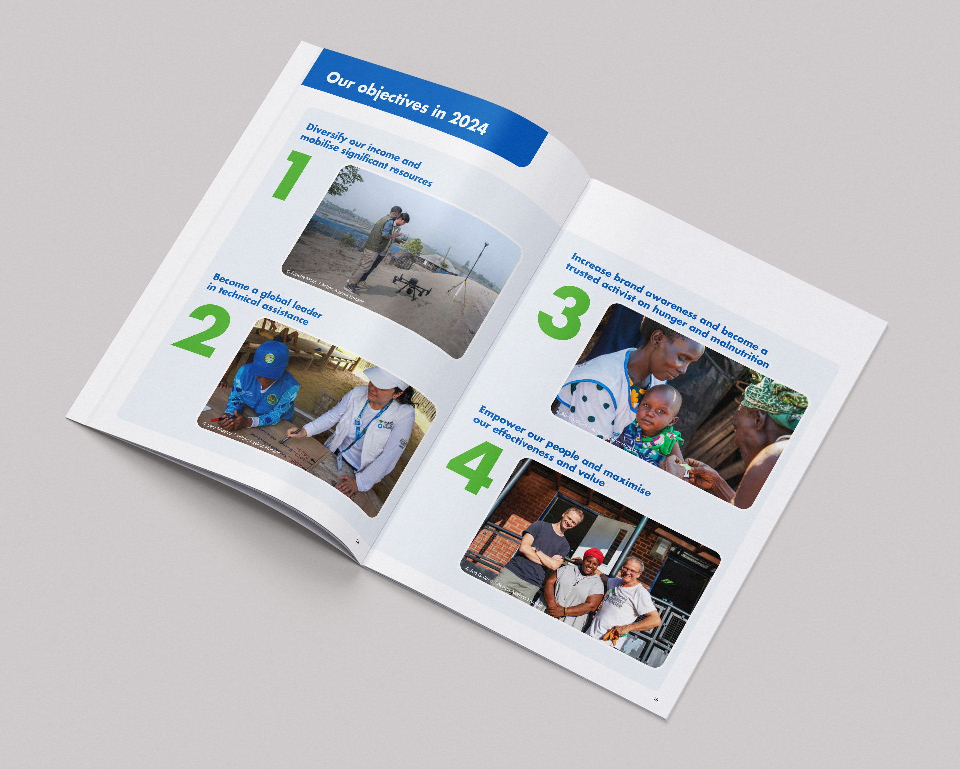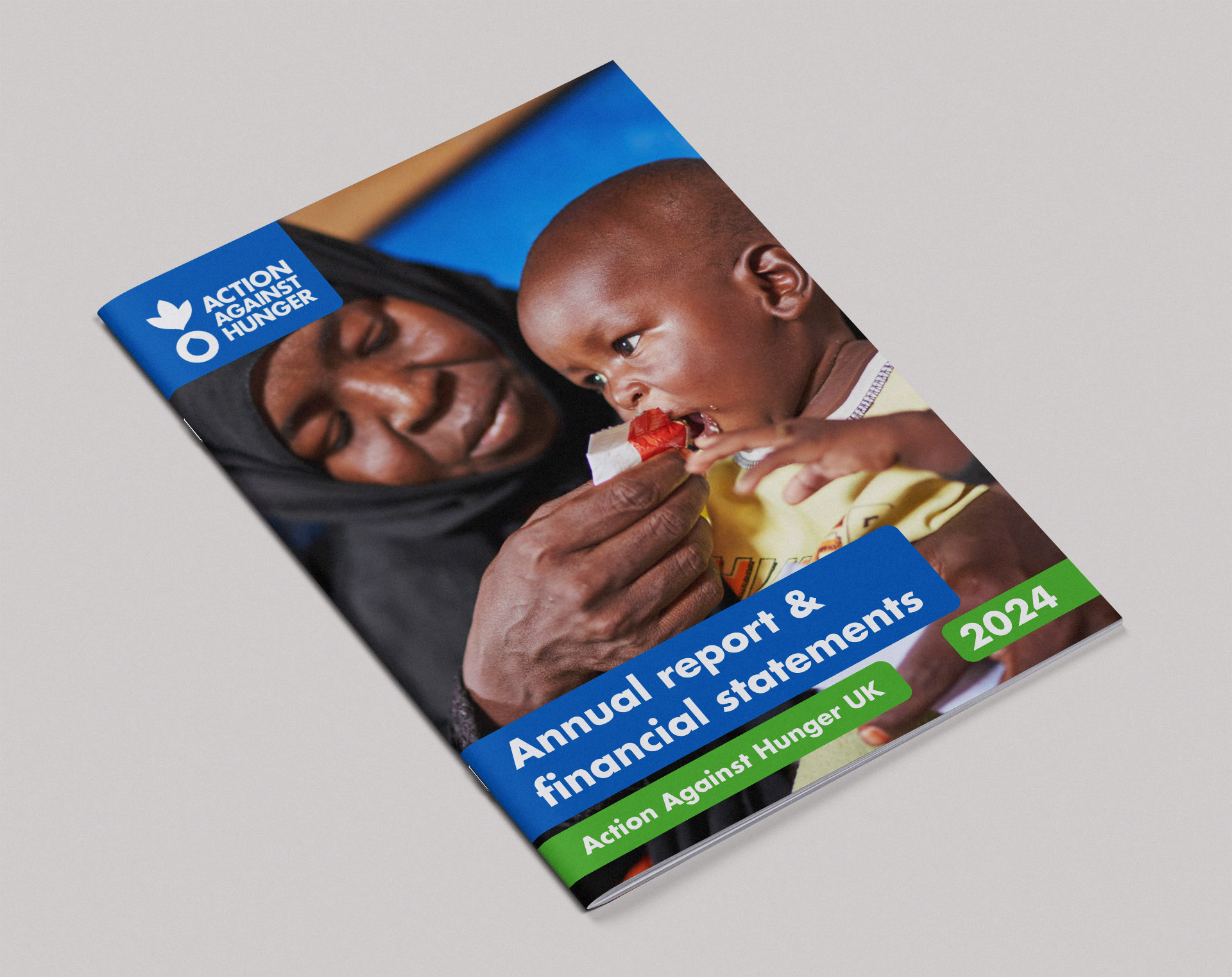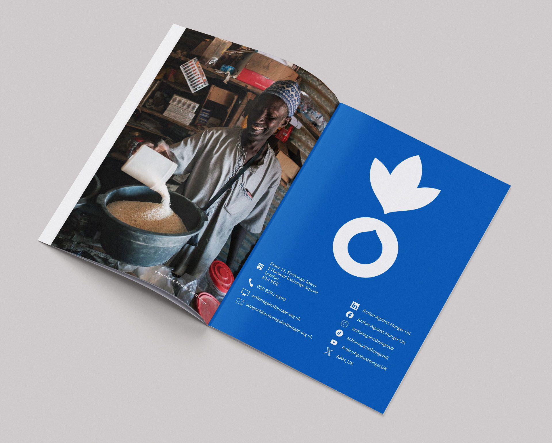 I carefully selected the most powerful images, displaying them at full-bleed to tell a striking visual story about the people Action Against Hunger help.