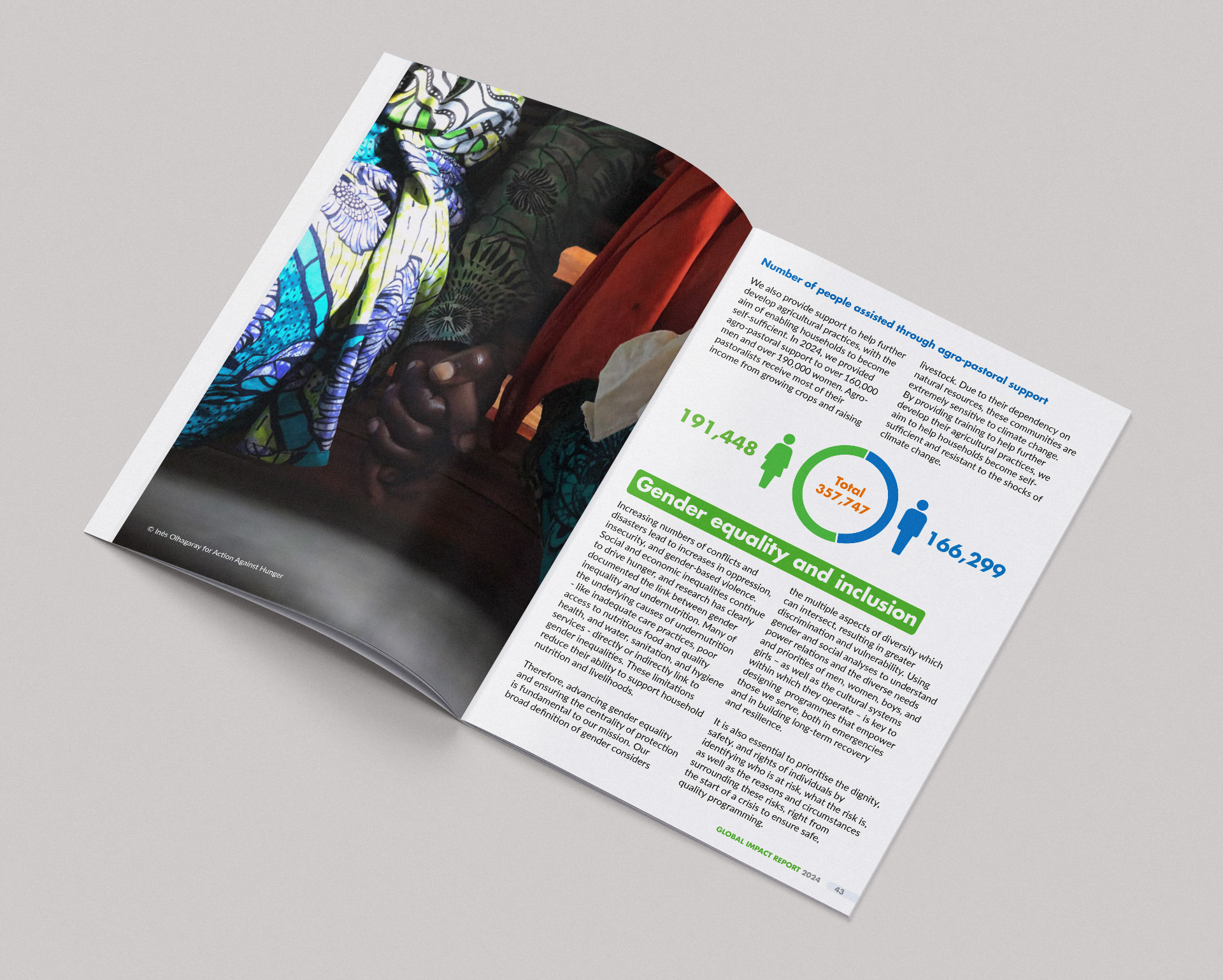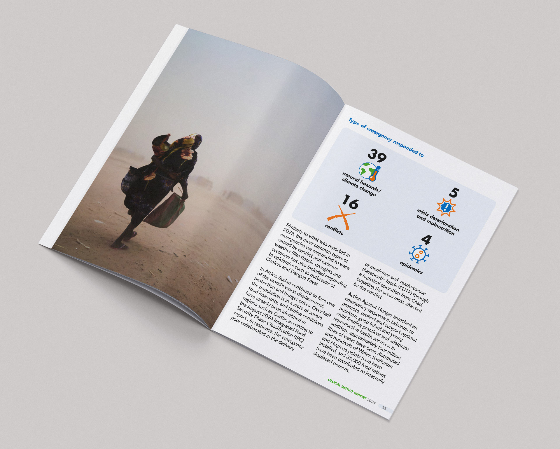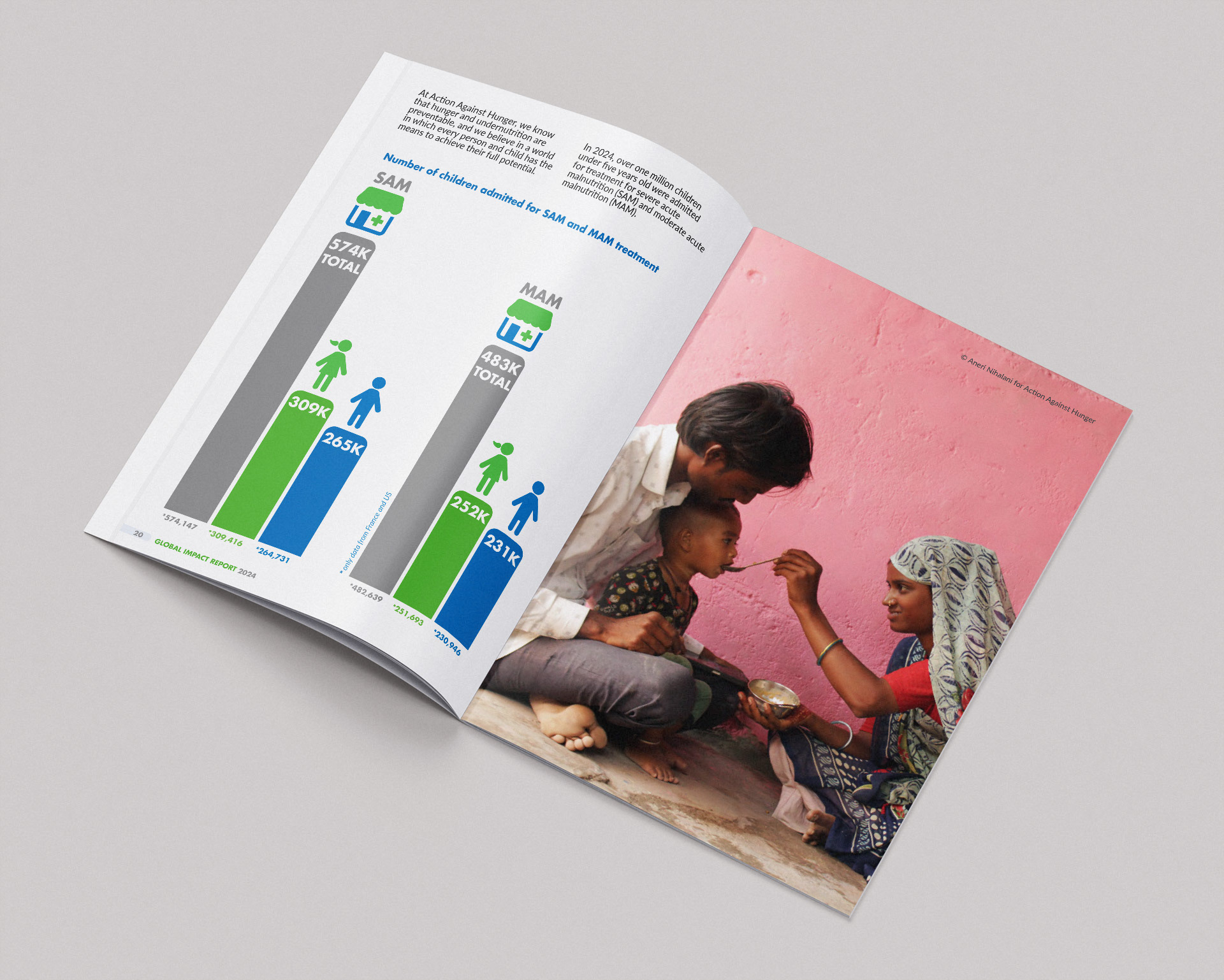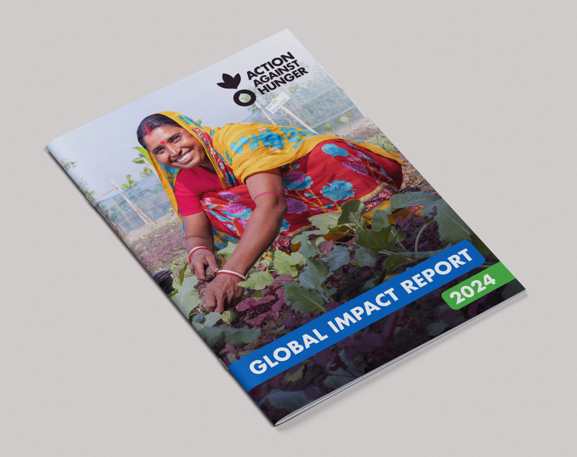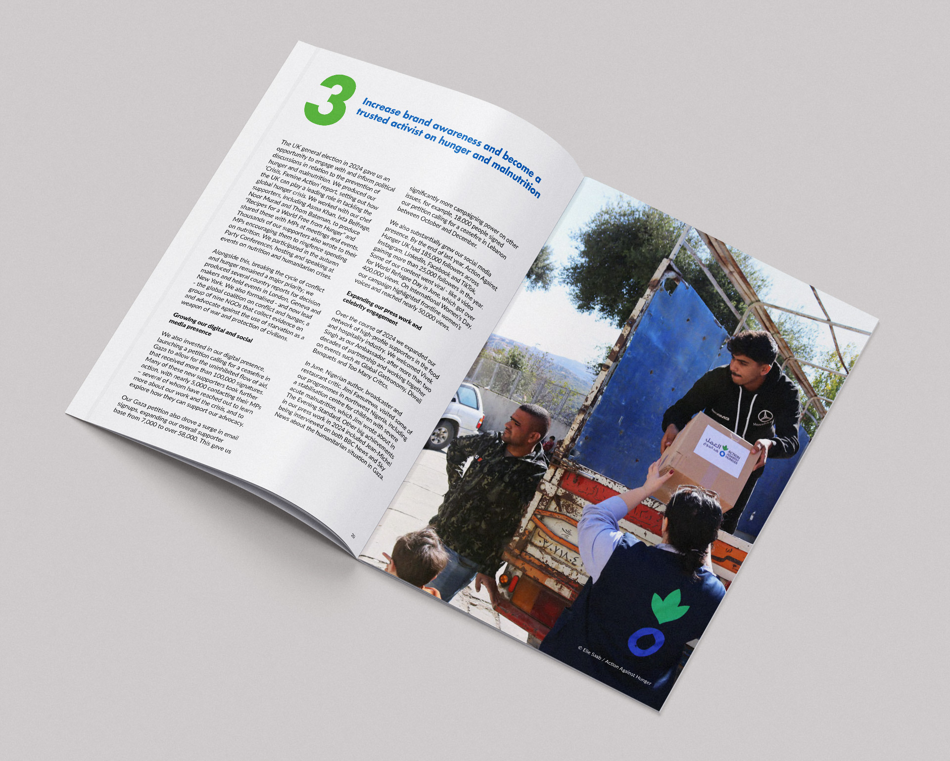 I carefully selected the most powerful images, displaying them at full-bleed to tell a striking visual story about the people Action Against Hunger help.