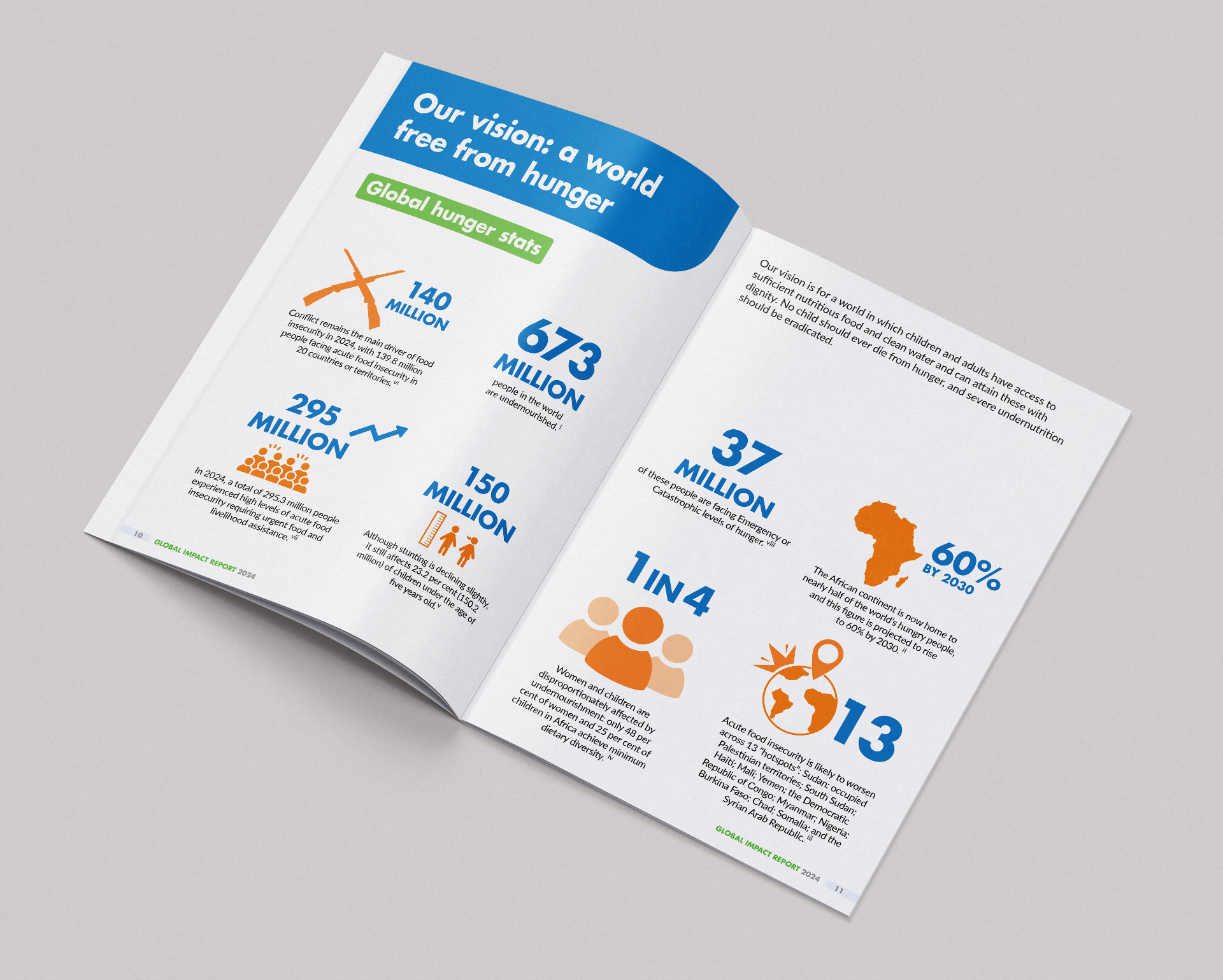 Design Action Against Hunger’s 96-page Global Impact Report for supporters and 62-page Annual Report for trustees and regulators, highlighting the charity’s great work to end world hunger.